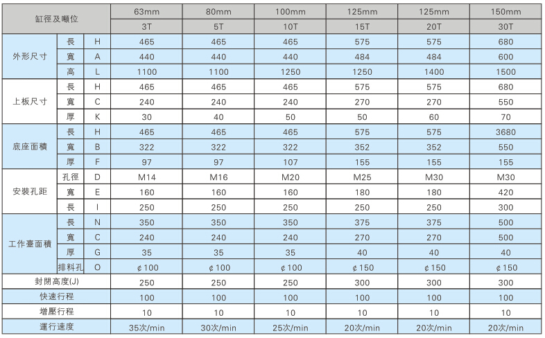 JRI四柱型臺式增壓機(jī)缸徑及噸位: